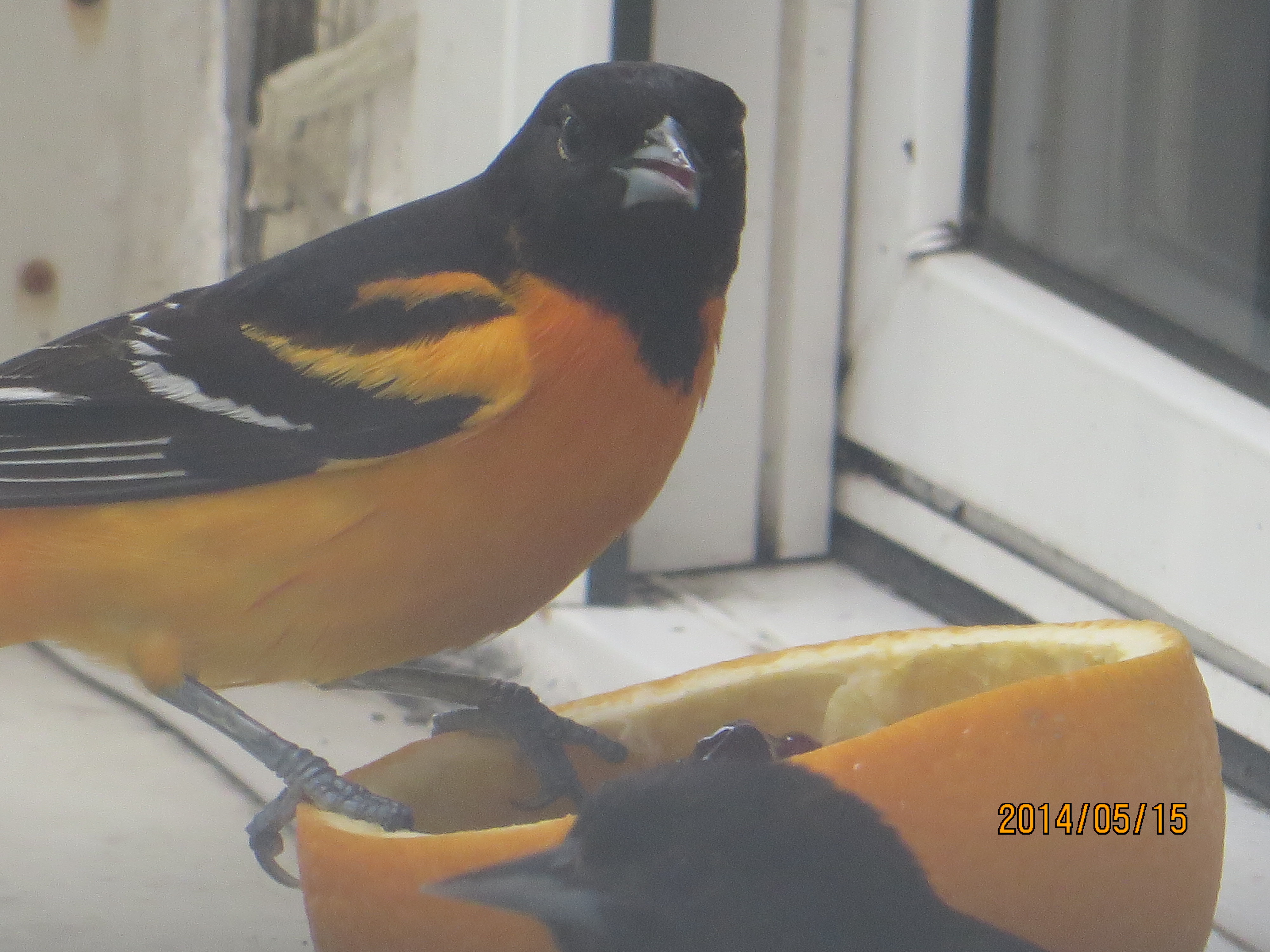 A couple of weeks ago my wife bought oranges at the store, which I cut in half and placed on our shrubs and in the maple tree just outside our kitchen window. A few days later I hung the oriole feeder from a branch that extends to within fifteen feet of the house. A day or two after that, I cut another orange in half, scooped out the fruit and filled the half-circle of the peel with grape jelly and then set it on the windowsill.