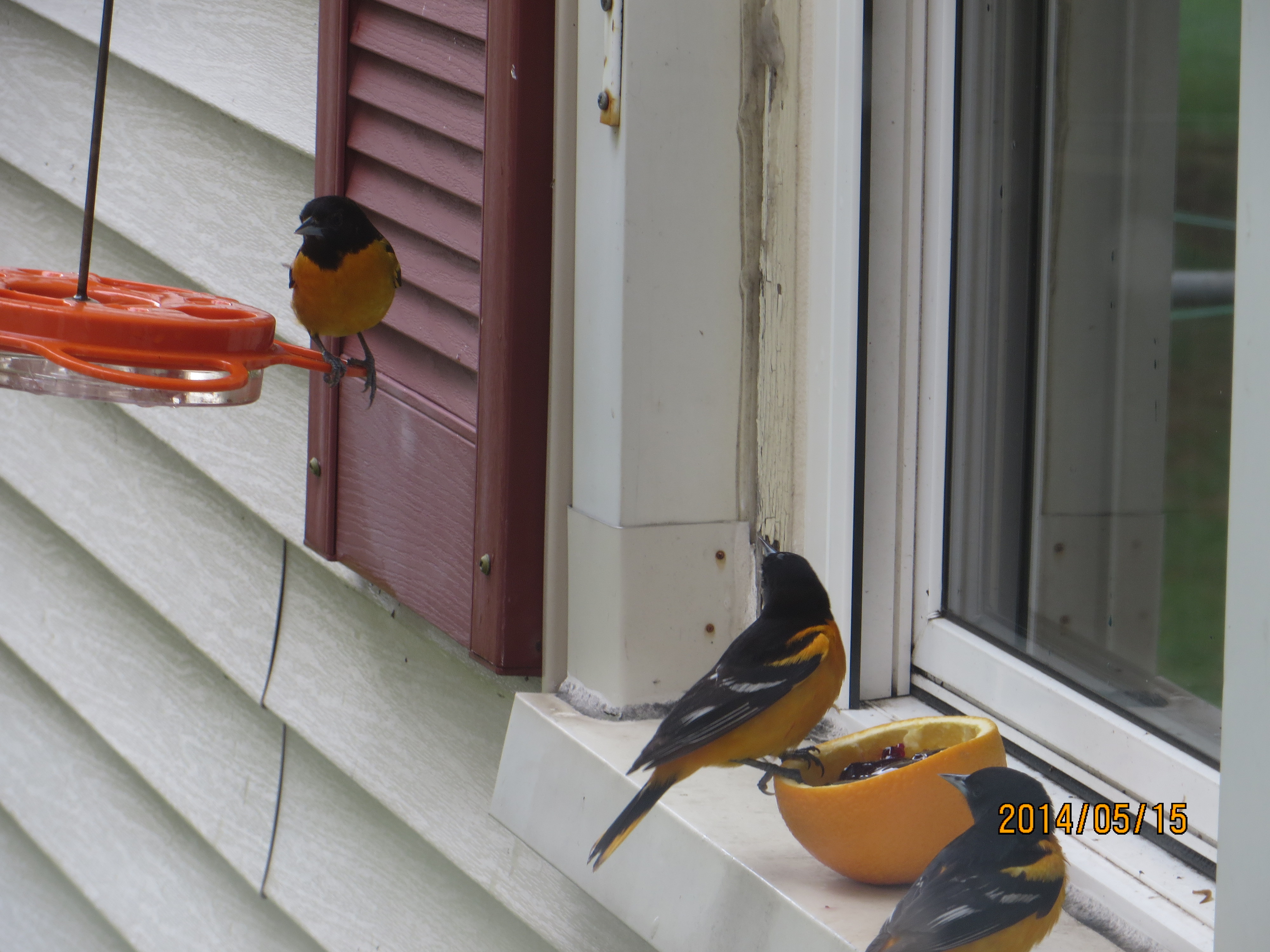 The next day the orioles arrived. They sit on the feeder and nibble at the orange. They alight on the hummingbird feeder that hangs by the window and jump down onto the sill to eat the jelly. Sometimes there are three orioles on the windowsill at once, squawking angrily at one another, each impatient to take its turn.